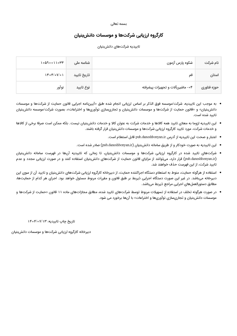 اطلاعات مربوط به تأییدیه شرکت از طریق سامانه رسمی شرکتهای دانشبنیان به نشانی pub.daneshbonyan.ir قابل استعلام است.