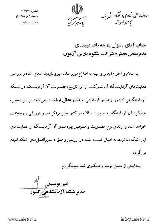 عضویت آزمایشگاه شکوه پارس آزمون در شبکه آزمایشگاهی فناوری‌های راهبردی کشور